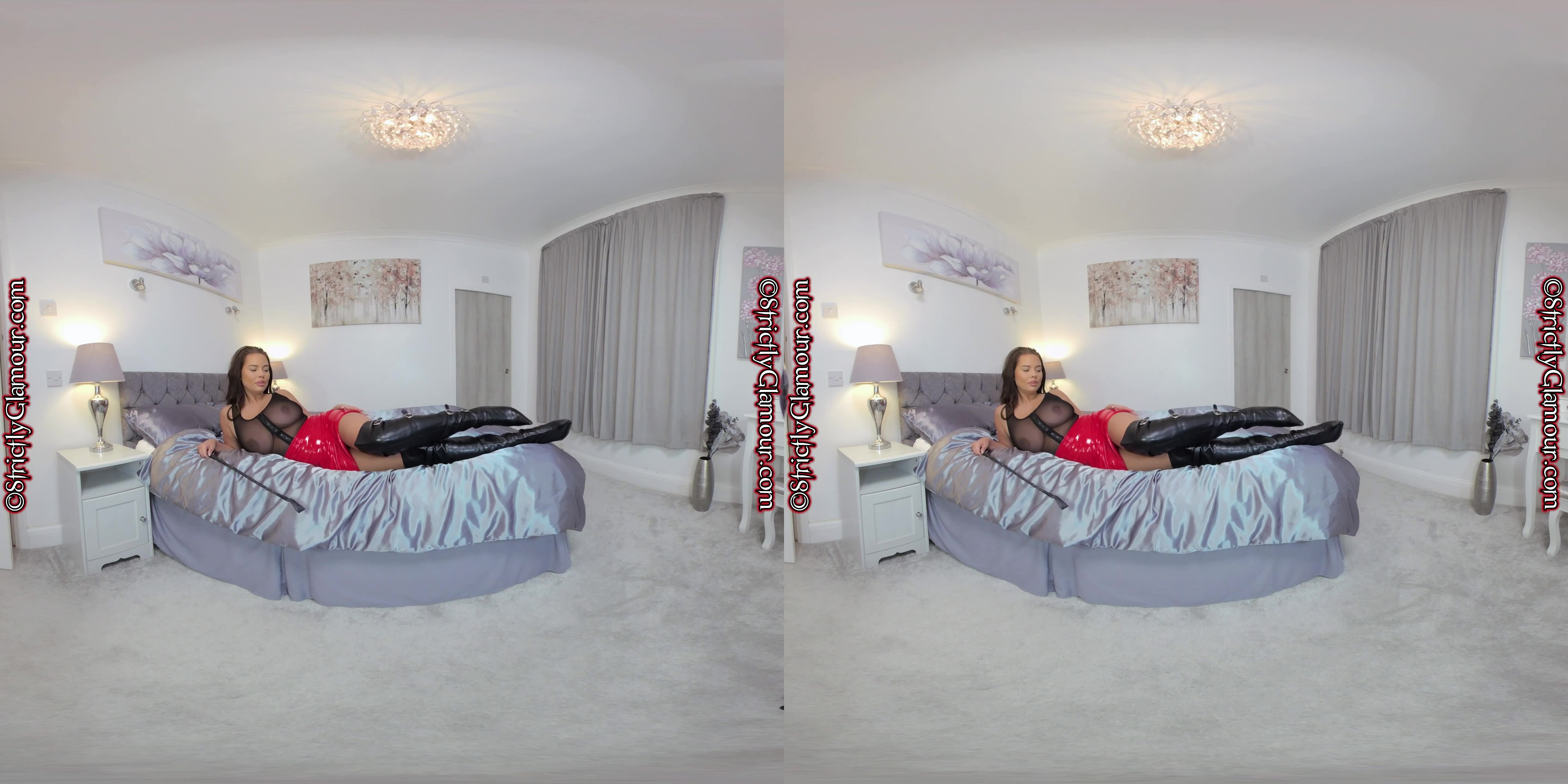Kay wearing a tight bright red PVC mini-skirt, black sheer/mesh bodysuit, over-the-knee high-heeled boots steps forward with her trusty riding crop in hand to deliver a performance that is guaranteed to get a rise from you!