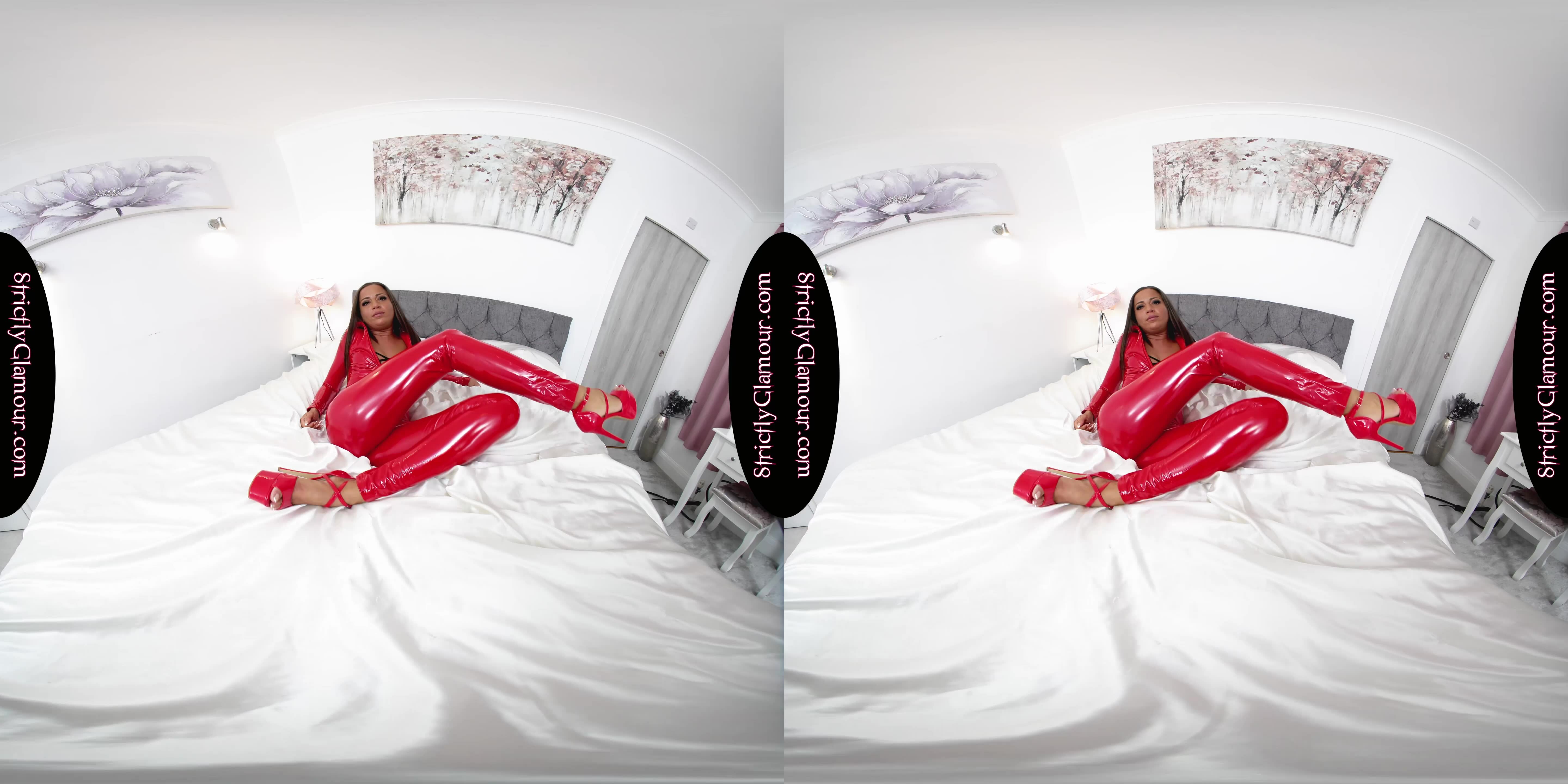 Lara Lee's sultry mistress persona shines in this 8K VR video, as she tantalizes and teases in her red PVC catsuit, black bra, and thong. She brandishes a leather bullwhip with finesse, ensuring all losers are kept firmly in their place!