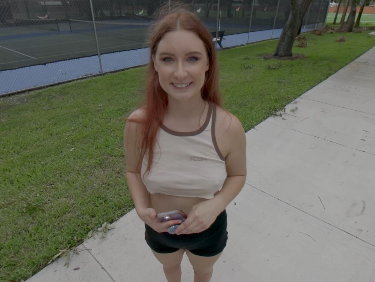 You decide to head to the local park to see if there are any hot babes there working out and a gorgeous redhead girl is waking around the park. You decide to pull your moves on her and stop her for walking too fast. She thinks you are kind of funny and she likes your vibe so you go for more. You tell her you want to be her workout buddy and you could do a workout together right now at your place.
