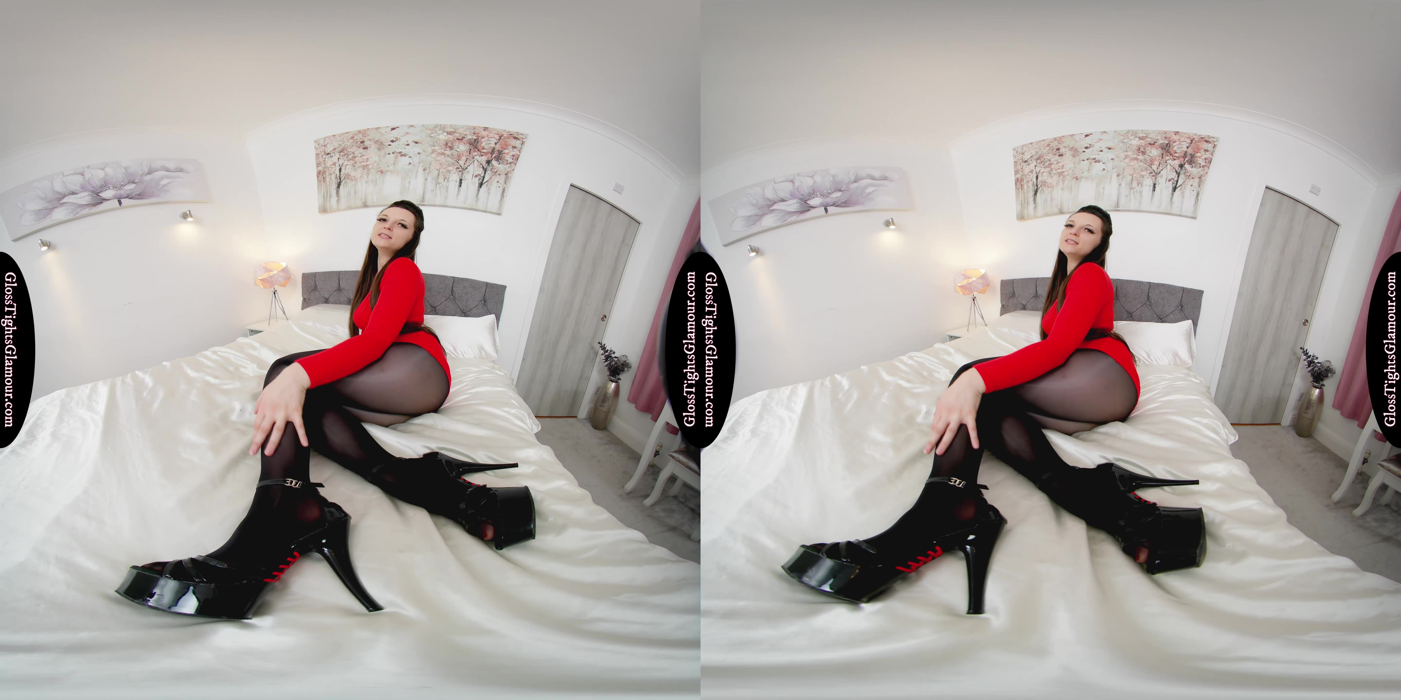 VR Video from shoot with Ivy Rain wearing a stylish red dress (sans bra), black glossy tights/pantyhose (sans briefs/panties), and black high-heeled open toe shoes that stay on throughout, in an exhilarating naughty tease to implied nude that provides close up experience of her legwear, and of course, much more besides!