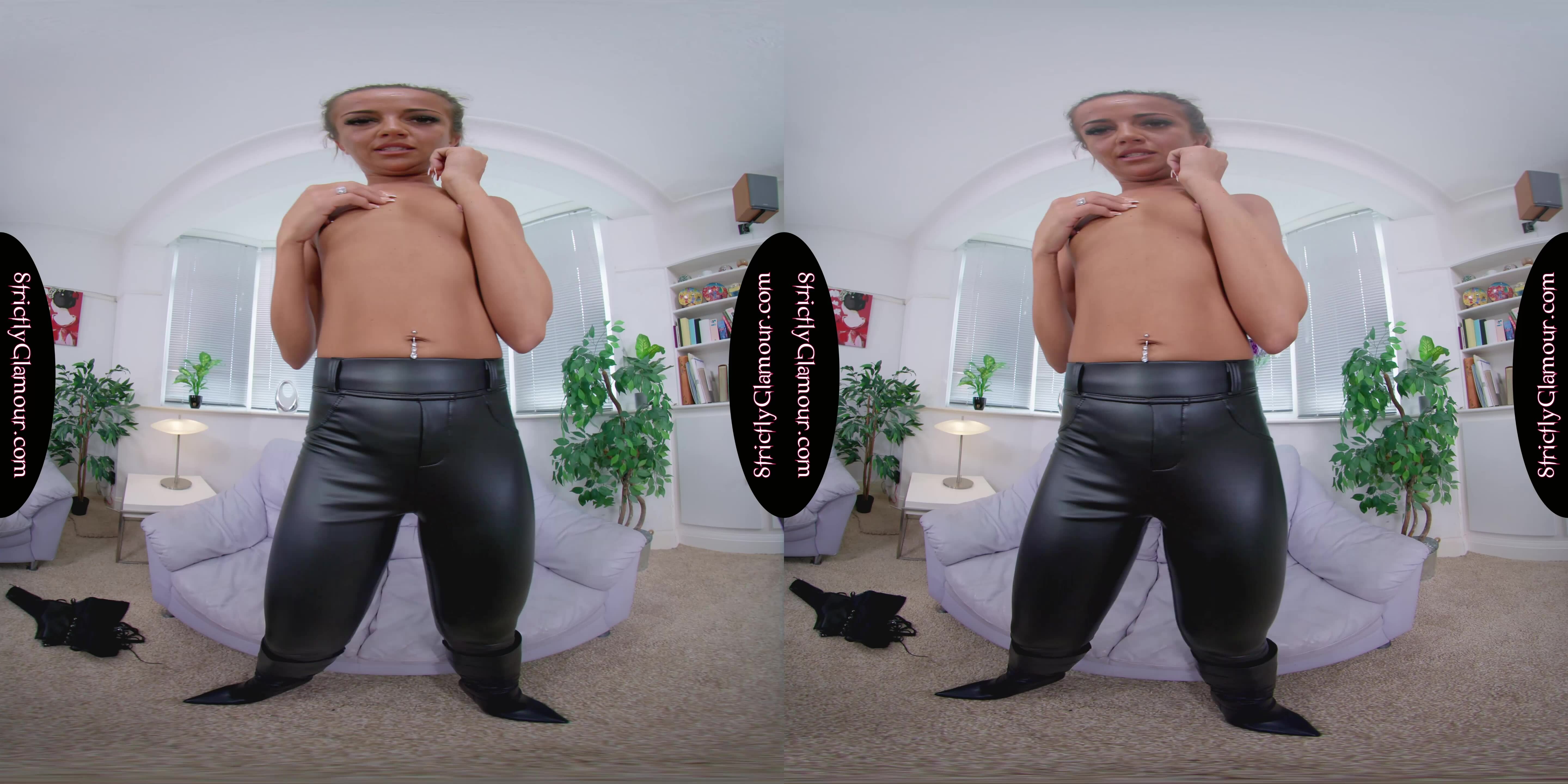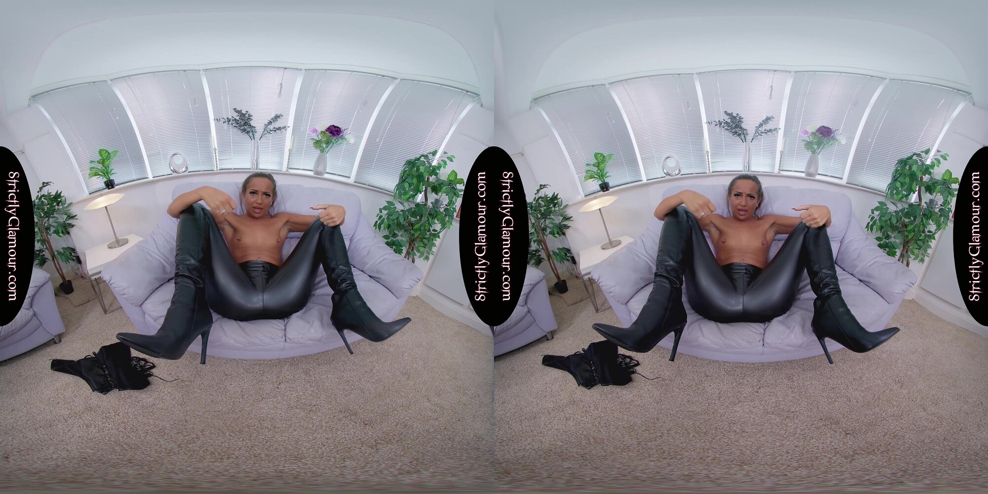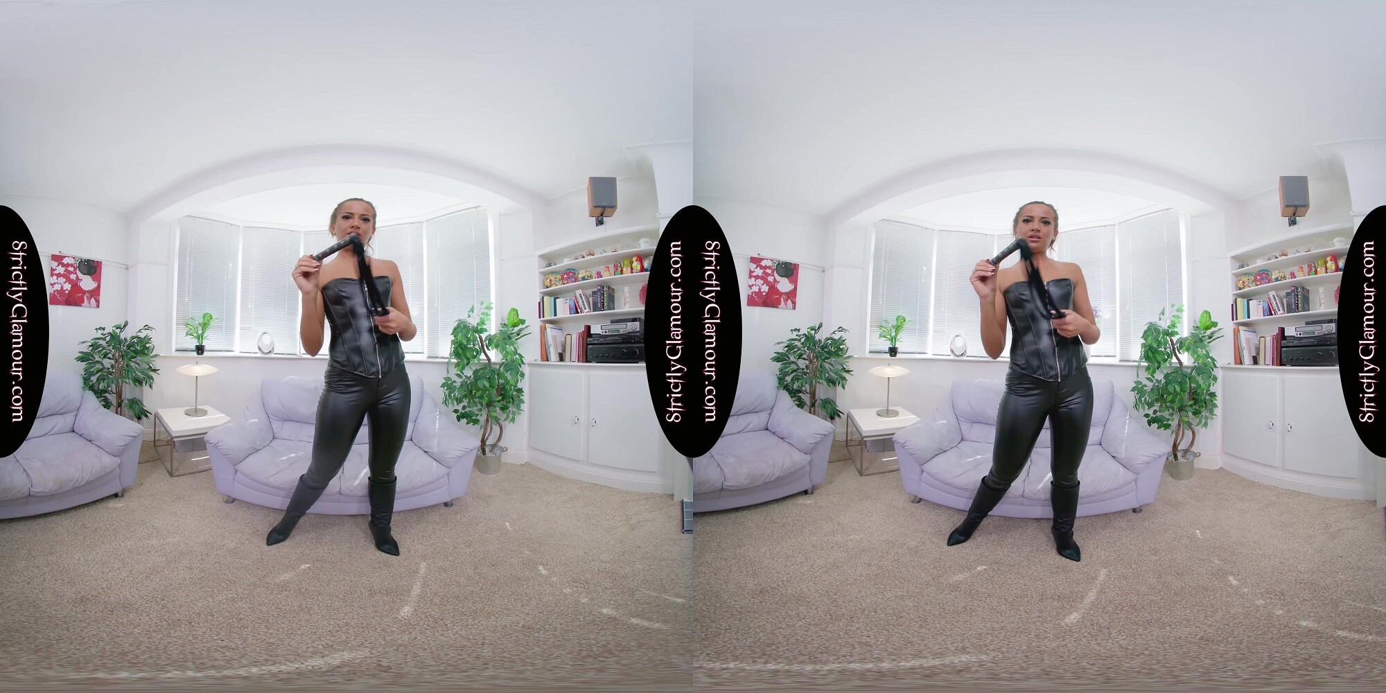 8K 60fps VR Video from shoot with mistress Lara Lee wearing a black leather zipper top with back laces (sans bra), black skintight wet look trousers, with black thong/g-string underneath, and black knee-high boots, brandishing a flogger whip, in a strict tease to topless, with plenty of vocal JOI encouragement towards the end!