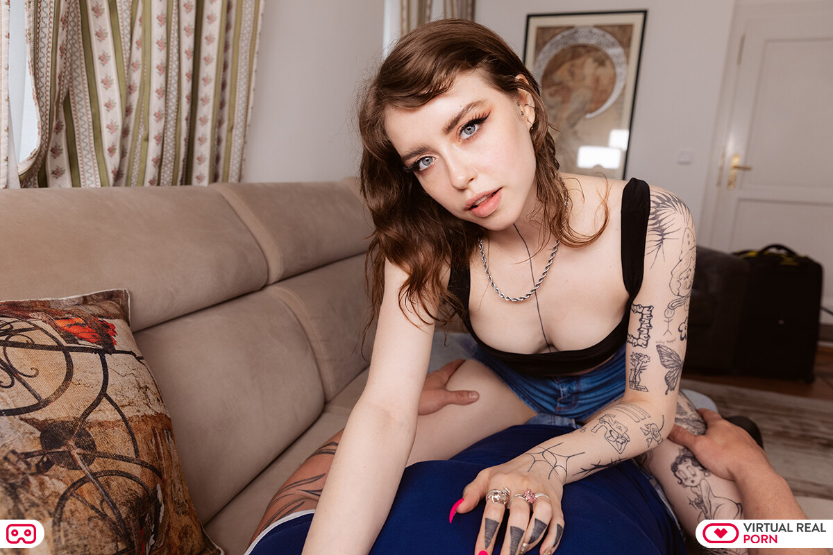 Tattooed hottie, Eden Ivy, can’t hide her excitement as she meets you after a long time. The petite brunette quickly shows how much she misses you with her body. She takes out your stiff rod and gives it a sensual blowjob. The gorgeous babe then rides your shaft in cowgirl and reverse cowgirl. You can’t help but admire her natural tits and round ass while you pound her wet pearl in missionary and doggy. Her sensitive lady part tightens around your shaft as she cums hard. After pleasing Eden, you continue to pound her on the couch before cumming all over her pretty face.