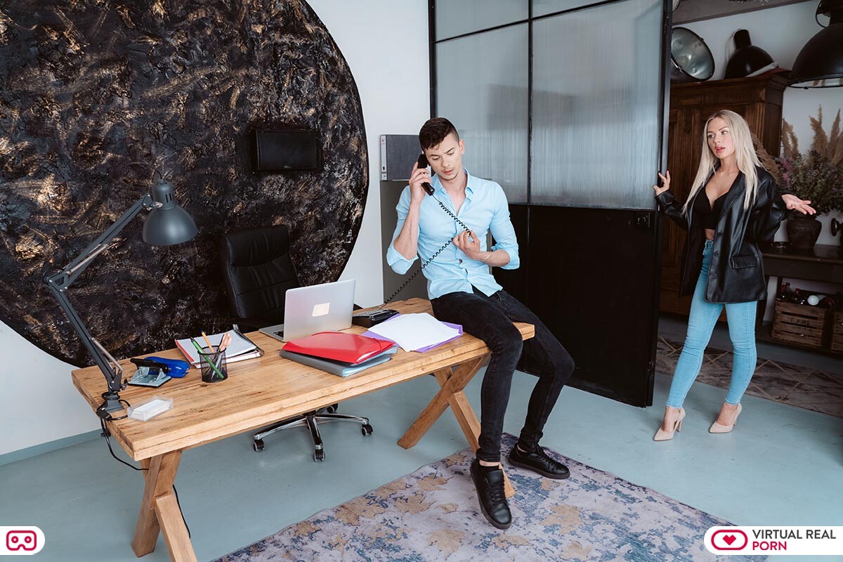 The executive manager Angie Lynx is coming to see you. You are on the phone, speaking with a client. When she realizes that you were speaking with the boss of that firm, she tells you that he was flirting with her the whole conference… and he is hot! When she sees your face, she laughs and tells you that you don’t have to be jealous, because you are the only executive that she likes to fuck with.