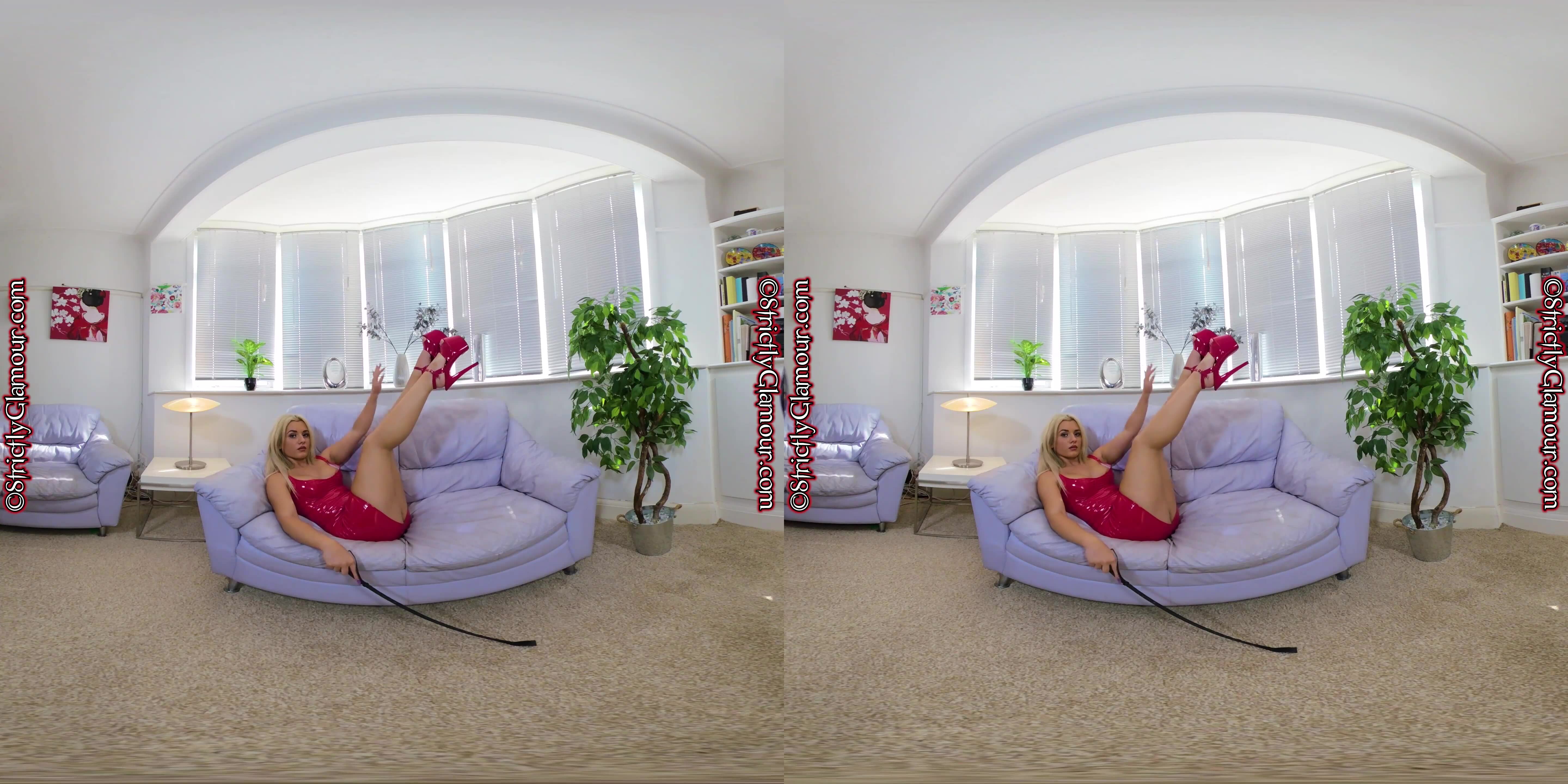 8K 60fps VR Video with femdom/findom mistress Monika Lara Smith (MLS) wearing a red pvc outfit comprising; body suit (sans bra & briefs/panties), mini/micro skirt, black holdup stockings with lace tops,...