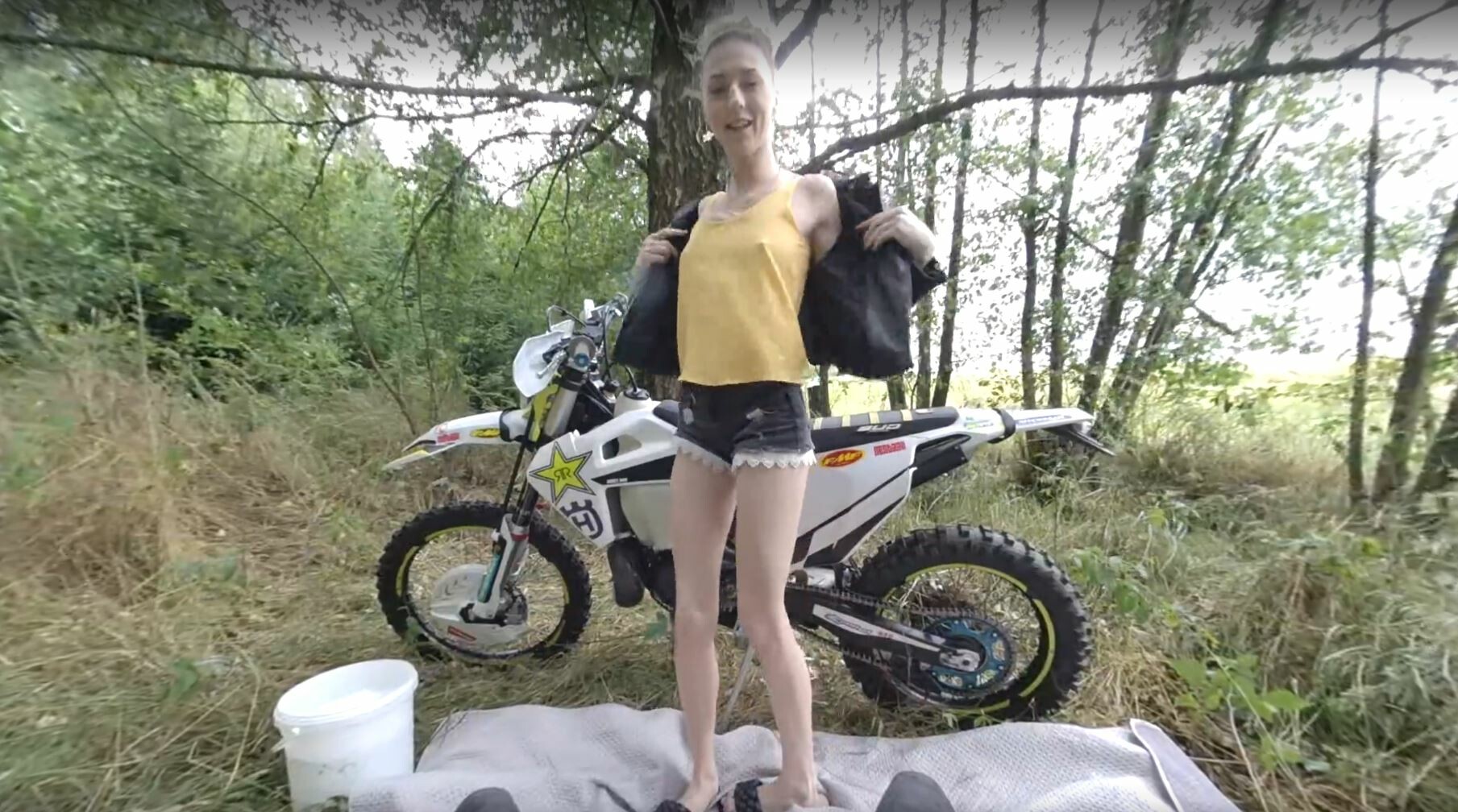 Isabela borrowed your motorbike, and now she wants to wash it for you. She starts to wash your motorcycle, and then Isabela’s entire T-shirt is wet, her breasts are visible, and she wants to thank you in a different way. First, you will start in the cowboy position, and then she will tell you she wants sex from behind, right next to the motorcycle. You enjoy sex until you squirt on her breasts and face.